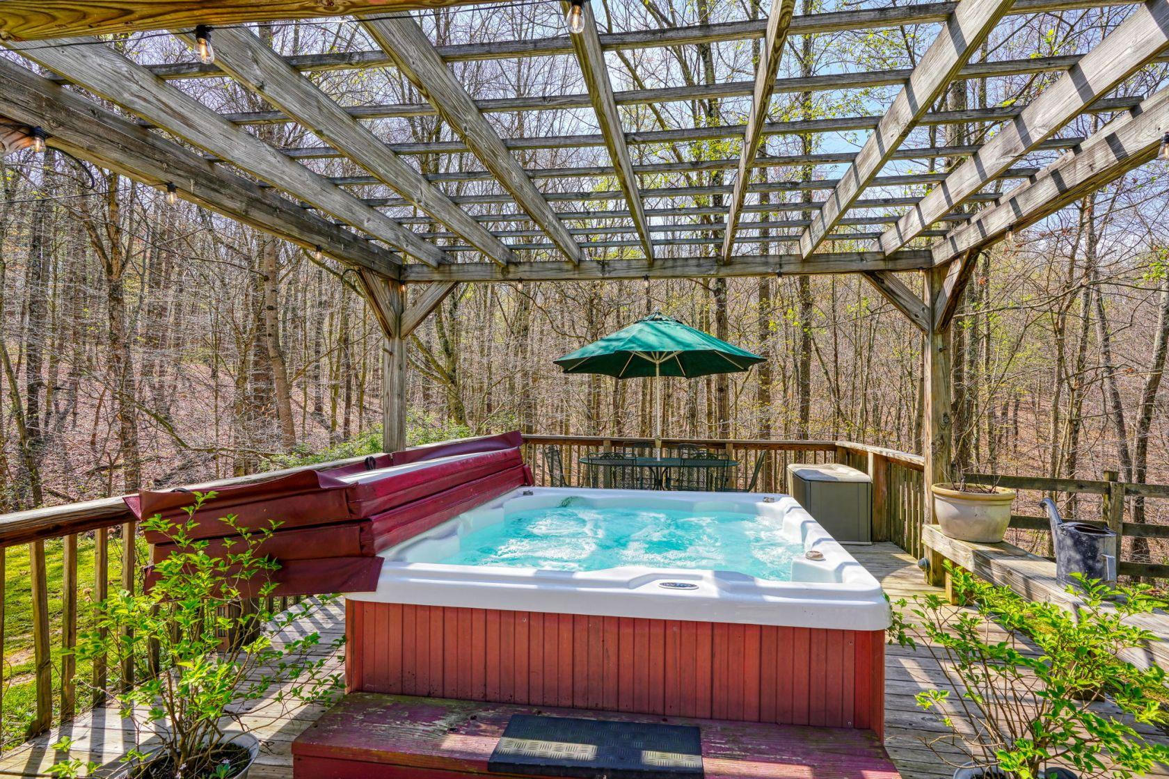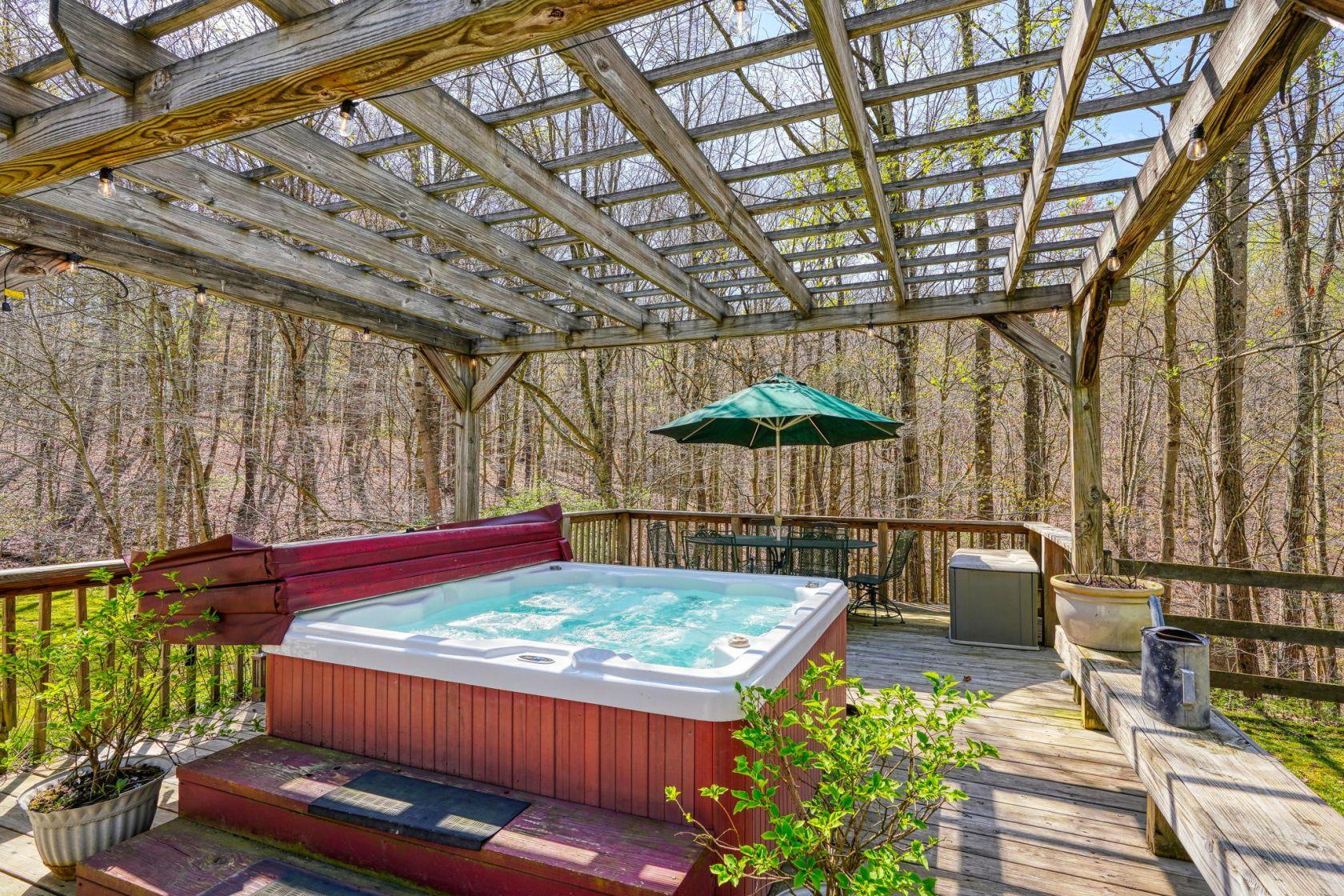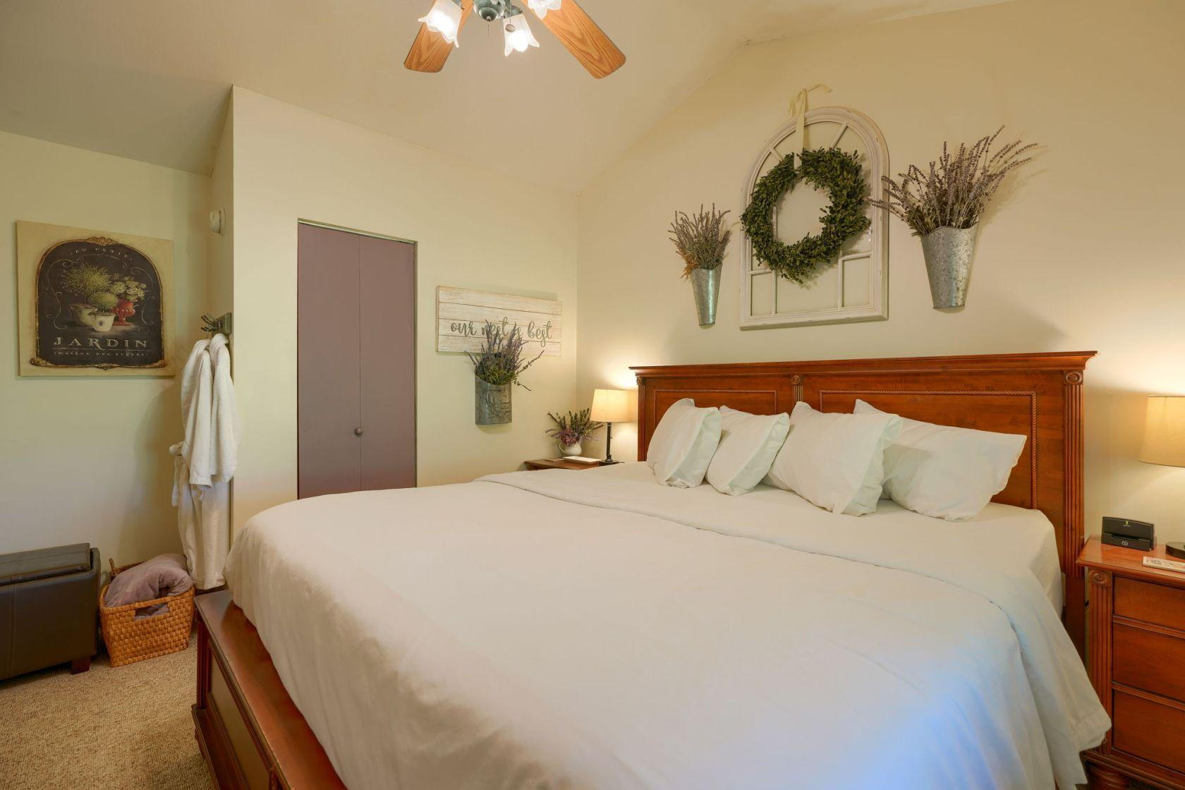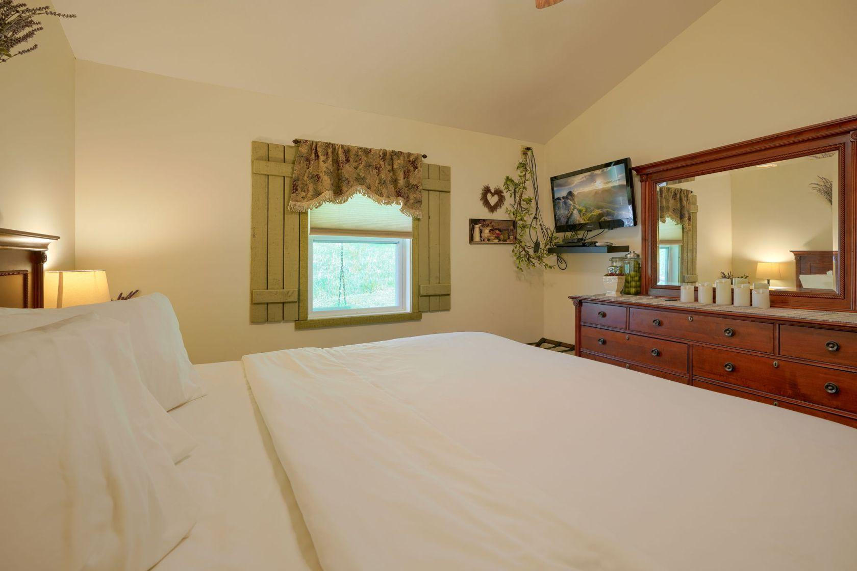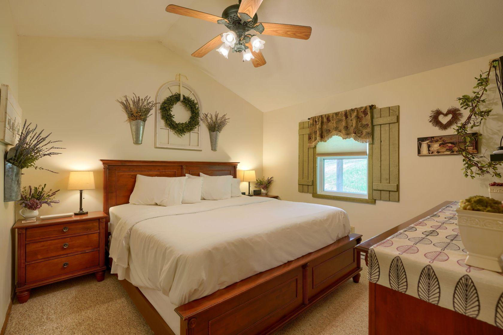 Carp's Cabin has 2 separate bedrooms. The master bedroom has a king size bed and the 2nd bedroom has a queen size bed.